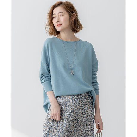 天竺で編みたてたボートネックのオーバーサイズのプルオーバー。コットンポリエステルのほど良いハリ感で、体のラインを拾わないストンとしたきれいなシルエットで着ていただけます。しっかりとヒップをカバーできるチュニックレングスで、タイトなボトムとのスタイリングも安心です。型崩れしずらい素材感と、さくっと着られてサマになるデザインで、デイリー使いに活躍します。脇線を少し前に振って裾にスリットを開けることで軽やかに仕上げました。襟もとのくるんとさせた仕様もさりげないポイントです。カラーは、明るい印象のレッド(#010)、やわらかな雰囲気のベージュ(#033)、ニュアンス感のあるライトグリーン(#062)、ベージュとの配色が抜け感のあるオフ×ブラック(#105)、グレーと組み合わせたシックなオフ×ネイビー(#175)、ベージュとの洒落感のある組み合わせが目を引くオフ×セージ(#162)の6色展開です。