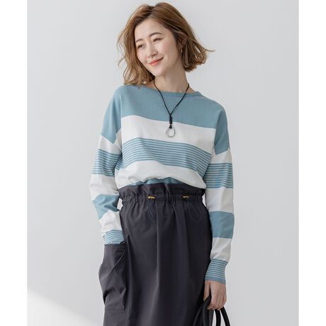 天竺編みの長袖ショート丈のニット。身頃はオフボディでゆったりとしたシルエットに仕上げました。襟もとはボートネックで、肌寒い時季はブラウスやカットソーとレイヤードしたり、春先には一枚着として着用でき、長いシーズン活躍します。ワイドパンツと合わせると抜け感がプラスされ、タイトなボトムやスカートと合わせるときれいめな雰囲気を楽しめます。カラーはボーダーのみの展開で、やわらかな雰囲気のベージュ×オフ(#133)、洒落感のあるセージ×オフ(#162)、上品な印象のネイビー×オフ(#175)の3色展開です。