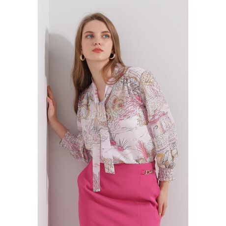 コットンのようなナチュラルなタッチでありながら上品な光沢としなやかさを併せ持ったツィル素材を使用。ポリエステルなのでしわになりにくいのも特徴。プリント海底の街並みの風景画を線画タッチで描いています。掠れ調の線でモチーフを描くことで優しく儚い表現になります。
