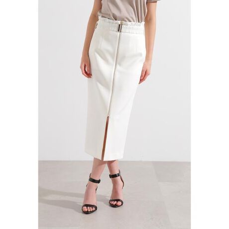 スッキリとしたタイトめのシルエットとハイウエストデザインが特徴のスカートは、スタイルアップ効果も期待できる一着です。フロントのジップが程よいアクセントとなり、ウエスト部分にはタフタ素材との切り替えが施され、ギャザーゴムのベルトが程よいカジュアル感を与えています。様々なスタイルに合わせやすい洗練されたデザインが魅力のスカートです。