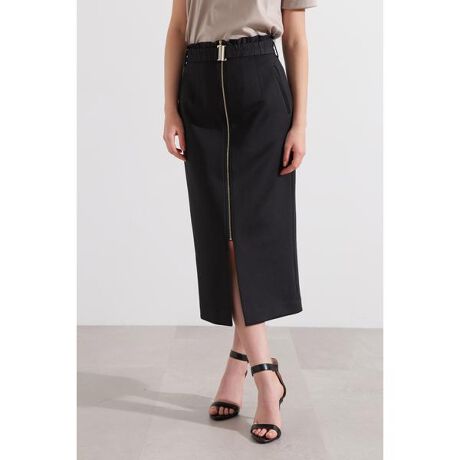 スッキリとしたタイトめのシルエットとハイウエストデザインが特徴のスカートは、スタイルアップ効果も期待できる一着です。フロントのジップが程よいアクセントとなり、ウエスト部分にはタフタ素材との切り替えが施され、ギャザーゴムのベルトが程よいカジュアル感を与えています。様々なスタイルに合わせやすい洗練されたデザインが魅力のスカートです。