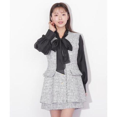 サマーツイードシリーズのペプラムジレ。ウエストを絞り、裾に向かってフレアに広がる今年らしいペプラムデザインです。気になるヒップラインが隠れる着丈にしており、挑戦しやすいデザイン。単品でパンツと合わせたり、同素材のミニスカパンツと合わせた時には、少しボトムの裾が出るバランスに仕上げています。「黒」太さや種類の異なる白黒の糸でMIXされたツイード素材を、「白」種類の異なる糸とシルバーラメ糸をMIXされたツイード素材を使用しています。同素材のミニスカショートパンツ(店舗商品番号125-5130013)とセットアップでも着用できます。※撮影時照明の関係により、色味が違って見える場合がございます。またパソコン・スマートフォンなどの環境により、若干製品と画像のカラーが異なる場合もございます。予めご了承ください。商品の色味は、商品単品画像をご参照下さい。※商品画像はサンプルのため、色味やサイズ等の仕様に変更がある場合がございますので、予めご了承ください。