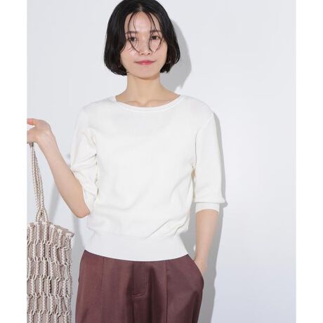 N.定番人気、着心地抜群の総針ニットです。首元に沿うネックラインが顔まわりをすっきりと見せ、女性らしさを演出。肘が隠れる袖丈のため、手首に抜け感を出せます。体のラインを拾いすぎないシルエットながら、裾まわりはリブなのでブラウジングのようにとまり、アウトスタイルが決まりやすい一枚。シンプルなデザインなのでボトムスを選ばず、ONもOFFスタイルにもお使いいただけます。