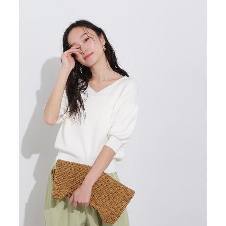 N.定番人気、着心地抜群の総針ニットです。Vネックラインがデコルテをきれいに見せてくれ、女性らしさを演出。肘が隠れる袖丈のため、手首に抜け感を出せます。ドロップショルダーや体のラインを拾いすぎないシルエットながら、裾まわりはリブなのでブラウジングのようにとまり、アウトスタイルが決まりやすい一枚。シンプルなデザインなのでボトムスを選ばず、ONもOFFスタイルにもお使いいただけます。