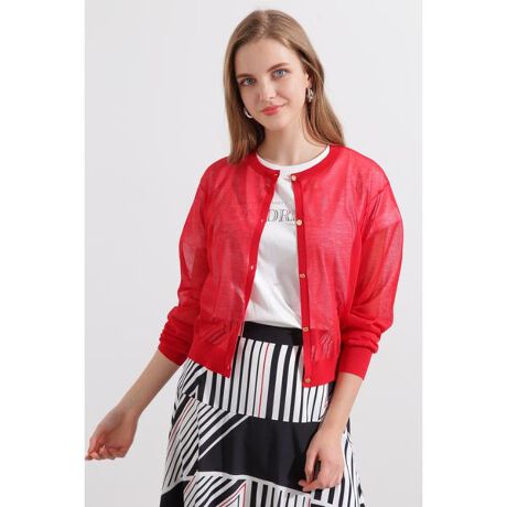 シンプルでクルーネックの長袖カーディガンです。しゃりっとした肌触りが気持ちのいいシアーニットカーディガン。シースルー素材が旬のシアーニットカーディガンです。上品なゴールドボタンがポイントになっています。ボタンを留めて短丈のカーディガンとしても、開けてゆったりとした羽織としても着られるので色々なボトムとも相性がいいです。