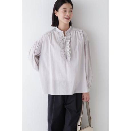 緩いシルエットのギャザースリーブのオーバーシャツ。前立てにあしらわれたフリルのつき方が個性的な一枚です。フェミニン過ぎず、少し後ろに抜いてラフに着るのがおすすめです。