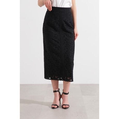 凹凸感豊かな表情のレース素材で作られたスカート。タイトなシルエットがスッキリとした印象を与え、ハイウエストデザインとフロントの縦に切り替えた別布がスタイルアップ効果を実現しています。同素材のブルゾンと合わせたスタイリングは、さらに洗練されたスタイルを引き立てるおすすめのコーディネートです。