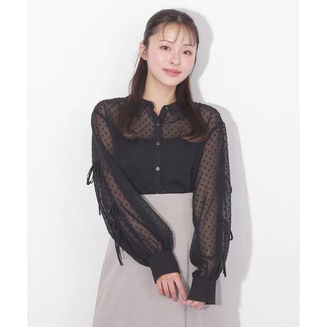 シアー感のある素材で女性らしいフェミニンさを出せるシャツアイテム。トレンドのリボンディテールを袖に取り入れた今年らしいシアーシャツです。袖にはさりげないスリットを入れてるので、上品な肌見せが叶います。バックスタイルにはシャーリングを入れてボリューム感を出した、全方位かわいいデザインです。同色のインナーキャミソール付なので合わせに迷わず着られます。ショート丈なのでパンツはもちろん、スカートにも合わせやすくておすすめです。黒とホワイトはシアードット柄、ブルーはシアーストライプ柄です。※撮影時照明の関係により、色味が違って見える場合がございます。またパソコン・スマートフォンなどの環境により、若干製品と画像のカラーが異なる場合もございます。予めご了承ください。商品の色味は、商品単品画像をご参照下さい。※商品画像はサンプルのため、色味やサイズ等の仕様に変更がある場合がございますので、予めご了承ください。