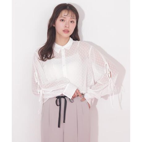シアー感のある素材で女性らしいフェミニンさを出せるシャツアイテム。トレンドのリボンディテールを袖に取り入れた今年らしいシアーシャツです。袖にはさりげないスリットを入れてるので、上品な肌見せが叶います。バックスタイルにはシャーリングを入れてボリューム感を出した、全方位かわいいデザインです。同色のインナーキャミソール付なので合わせに迷わず着られます。ショート丈なのでパンツはもちろん、スカートにも合わせやすくておすすめです。黒とホワイトはシアードット柄、ブルーはシアーストライプ柄です。※撮影時照明の関係により、色味が違って見える場合がございます。またパソコン・スマートフォンなどの環境により、若干製品と画像のカラーが異なる場合もございます。予めご了承ください。商品の色味は、商品単品画像をご参照下さい。※商品画像はサンプルのため、色味やサイズ等の仕様に変更がある場合がございますので、予めご了承ください。