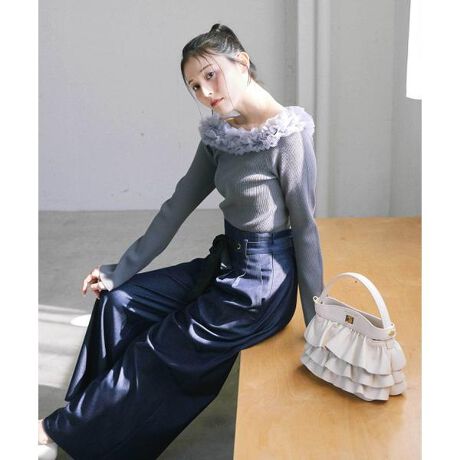 サテンリボンベルトが映えるデニムライクなワイドパンツ。落ち感のある柔らかい素材なのでカジュアルすぎず、女性らしい印象で穿ける1本。ハイウエストデザインで脚長効果を期待できます。ウエスト周りはすっきりとさせ、後ろはゴムが入っているのでフィットします。ウエストベルトはリボン結びで長さ調節可能。※撮影時照明の関係により、色味が違って見える場合がございます。またパソコン・スマートフォンなどの環境により、若干製品と画像のカラーが異なる場合もございます。予めご了承ください。商品の色味は、商品単品画像をご参照下さい。※商品画像はサンプルのため、色味やサイズ等の仕様に変更がある場合がございますので、予めご了承ください。