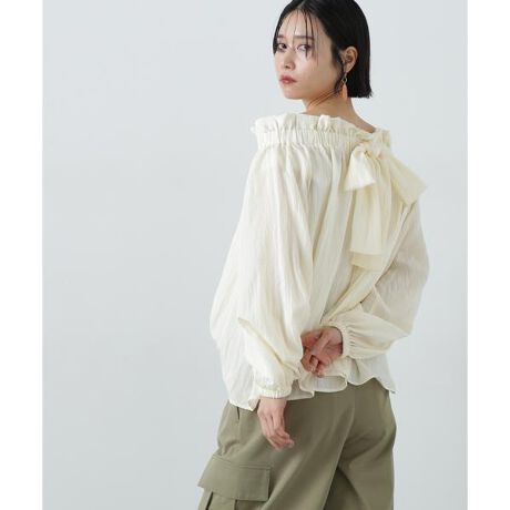肩を落としたオフショルデザインで大人の肌見せを叶えるブラウス。襟ぐりはゴムが入っているので、オフショルでもそのままでも、フィットしながら着られます。バックスタイルのリボンディテールが愛らしいアクセント。カーゴパンツ、デニムパンツ、マニッシュなパンツを合わせれば、大人のカジュアルスタイルを楽しめます。