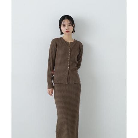 [型番:1665140307]カーディガン&スカートの2点セットでコーディネートが決まるニットSETUP。柄編みのセットアップなので単調すぎず、ラフになりすぎないコーディネートに見せてくれます。カーディガンはボタンの位置が特徴で、襟ぐりと前裾はスリット風のようなディテールで抜け感をプラス。一枚着としてはもちろん、お持ちのボトムスと合わせても着こなせます。