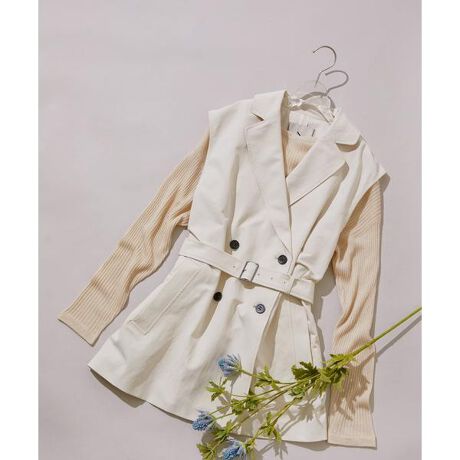 さらりと羽織るだけでレイヤードが叶うトレンチ風ジレ。バックスタイルはヨーク切り替えと裾センターベンツが入っているので、動きやすいデザイン。共地ベルトでウエストマークすれば、メリハリのあるシルエットが叶います。前を開けたままでも羽織れるデザインなので、コーディネートの幅が広がります。