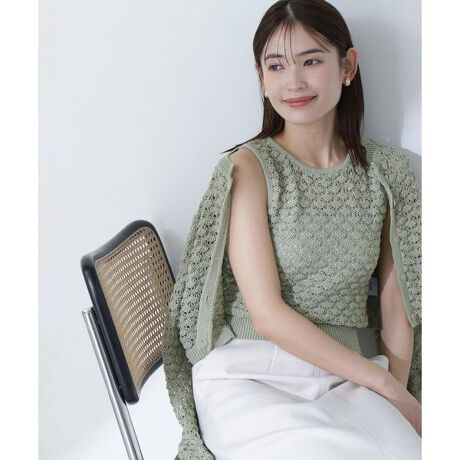 それぞれ単品使いもできるクロシェ編みのような編地のタンクトップとカーディガンのセットアイテム。透け感のある編地なので抜け感もあり、今の気分にぴったりなデザインです。カーディガンはクロップド丈のボックスシルエットで、カジュアル感もありながらフェミニンな印象で着ていただけます。<素材>リサイクルポリエステルを使用したサスティナブルな糸を使用。クロシェ編みのような透け感のある編地です。<詳細>仕様・ボタン裏地・なし透け感・あり / 光沢・なし / 伸縮性・あり 生地の厚さ・普通※モデルの着用画像の場合、光の当たり具合により、実際の色味と異なって見えることがございます。色味は、商品単体の画像をご参照ください。