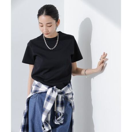 ややコンパクトなシルエットのクルーネックTシャツ。程よいハリと厚さがある素材なので、体のラインを拾わず体型がバーが叶う一枚です。