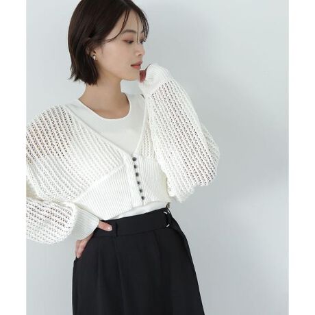 アメスリのプレーンなニットタンクトップと深いVネックのニットカーディガンを合わせた新鮮なアンサンブル。タンクトップは単品使いもしやすいミニマルなデザインで、アメスリ具合も着やすいカッティングです。カーディガンはメッシュ編みのような柄編みにして抜け感のあるデザインに。また、裾は太幅リブに多連ボタンを付けてデザイン性をプラス。ワンピースの羽織りにもおすすめです。<素材>リサイクルポリエステルのサスティナブルな糸を使用。メッシュ編みのような透け感のある編地です。<詳細>仕様・カーディガンは前ボタン、タンクトップは開閉なし裏地・なし透け感・あり / 光沢・なし / 伸縮性・あり 生地の厚さ・普通※モデルの着用画像の場合、光の当たり具合により、実際の色味と異なって見えることがございます。色味は、商品単体の画像をご参照ください。