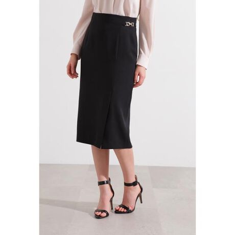 自然な光沢が上品で、カジュアルすぎない表情感が幅広いシーンで使いやすい1枚です。シンプルながら非常に綺麗なタイトシルエットのスカート。ウエストのメタルチャームがアクセントになったサイドベンツ入りのデザインで、足さばきもスムーズです。中肉のギャバで仕立てたスカートで、透けにくくシワになりにくいのも嬉しいポイントです。