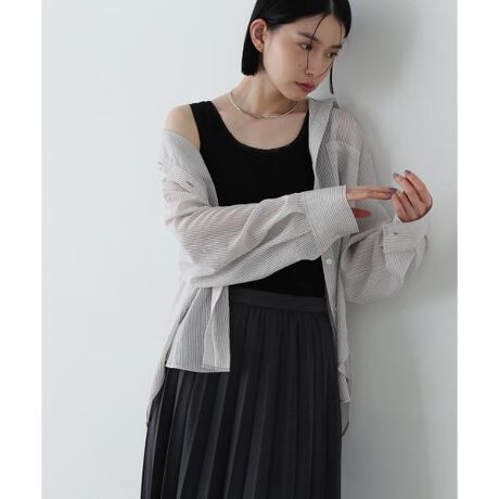 ヘルシーさを叶えるシアートリムタンクトップ。襟とアームホールにシアー素材をトリミングした、軽やかなデザイン。シンプルなネックラインで、デコルテを綺麗に見せてくれます。これからの季節、シアーシャツを羽織ったり、ジャケットインするのも大人っぽく着こなせるのでお勧めです。
