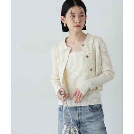 襟付きカーディガンとキャミソールを同色で揃えたアンサンブル。凹凸感のある編地が単調になりにくく、すっきり見えする着こなしに。カーディガンの大きめボタンもアクセント。デニムパンツ、マニッシュなパンツと合わせたコーディネートがお勧めです。