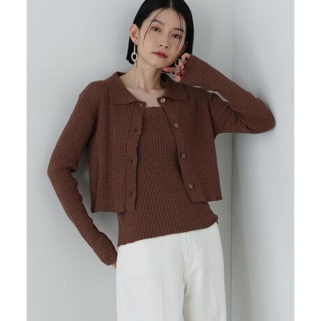 襟付きカーディガンとキャミソールを同色で揃えたアンサンブル。凹凸感のある編地が単調になりにくく、すっきり見えする着こなしに。カーディガンの大きめボタンもアクセント。デニムパンツ、マニッシュなパンツと合わせたコーディネートがお勧めです。