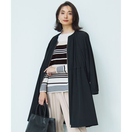 ドラマティックな雰囲気が女性らしいデザインのロングブルゾン。フロントのゴールドジップがアクセントになってカジュアルに見えがちなブルゾンを大人っぽく仕上げました。多めの分量感と前後差のある着丈なので、ウエストのドロストを絞ってメリハリのあるシルエットや(ウエストのドロストはバックデザインになっており後ろで調節いただけます。)、裾のドロストを絞って丸みのあるシルエットにと、アレンジ次第で様々なスタイリングをお楽しみいただけます。また、首元がすっきりとしているノーカラーなのでスカーフを巻いたコーディネートもおすすめです。ON/OFF両方で着用いただける便利なアウターです。カラーは、ベーシックなブラック(#005)、肌馴染みのいいブラウン(#030)、明るい印象のベージュ(#033)の3色展開です。