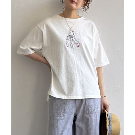 ラフなイラストタッチの女の子のプリントが雰囲気あるTシャツ。