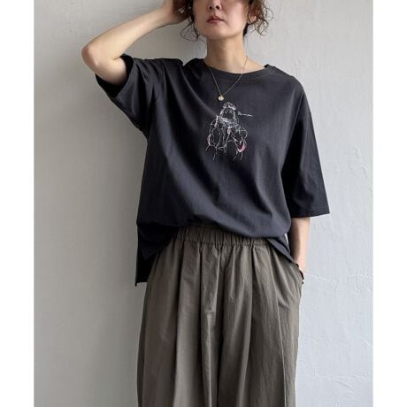 ラフなイラストタッチの女の子のプリントが雰囲気あるTシャツ。