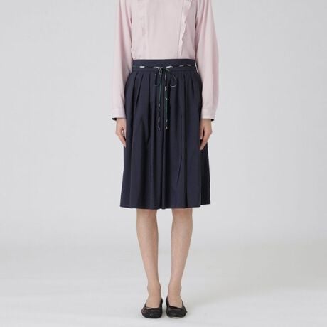 [型番:55S06525__]◆シルエットにこだわったAラインスカート【Design】柔らかく軽やかなAラインを描く膝丈スカートです。程よいタック分量で、ウエストから裾にかけて緩やかに広がるシルエットです。取り外し可能なチェックの紐がアクセントになります。トップス次第でシーンレスに活躍するアイテムです。