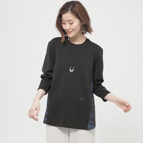 前身頃はダンボールニット、後ろ側はプリント素材を使用したコンビプルオーバー。スポンデッシュで柔らかいジャージーとプリント素材のコンビで、1枚で決まる便利なアイテム。シーズンレスな素材感で長く着用できるのが特徴です。