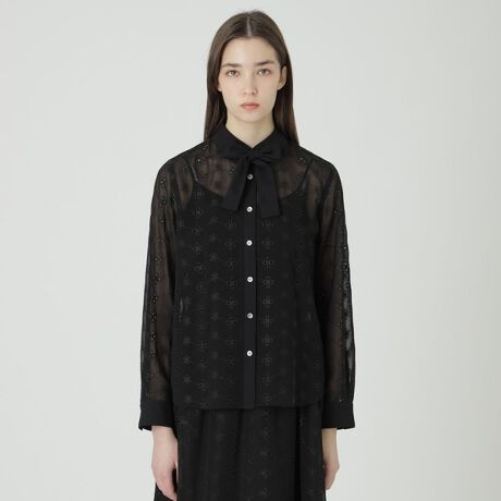[型番:55M05522__]◆華やかなエンブロイダリー素材のブラウス【Design】エンブロイダリー素材を使用した華やかなブラウスです。襟、前立て、カフス、リボンを無地素材で作ることで程よい甘さに仕上げました。【Styling】エンブロイダリーシフォンスカート(55S05522)とワンピース風のコーディネートはもちろん、デニムとの相性も抜群です。
