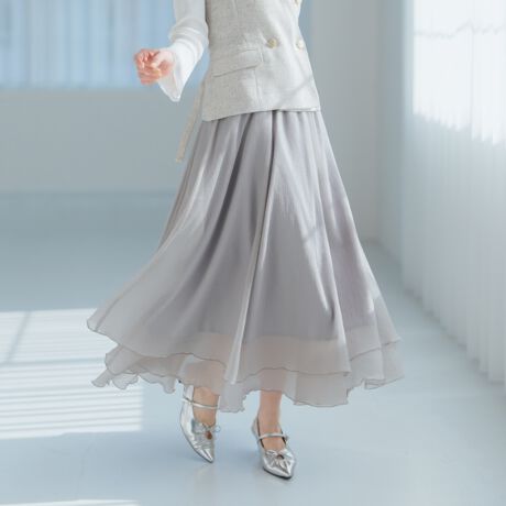 上品な輝きを放つラメシアー素材を重ねたレイヤードスカート。歩くたびにふわっと軽やかに揺れ広がるシルエットが、フェミニンな雰囲気を漂わせます。落ち着いた色合いで合わせやすく、カジュアルからキレイめにと幅広いスタイリングを楽しむことができるアイテムです。■fabric透け感[やや有り]裏地[すべて有り]伸縮性[無し]生地の厚さ[薄手]ウエストゴム[有り]ファスナー[有り]ポケット[無し]