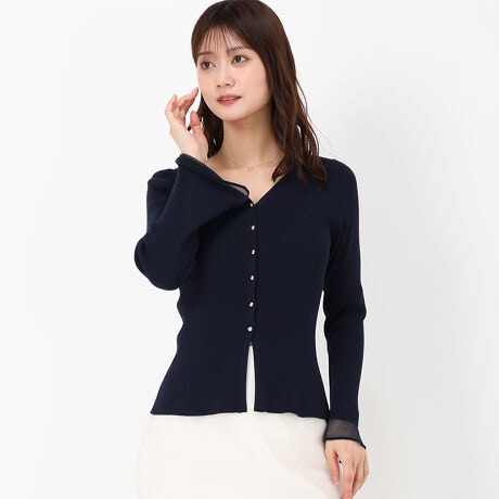 手元を軽やかにみせるシアー切替を施したフレア袖カーディガン。ボディラインに優しくフィットするリブニットとペプラムシルエットが女性らしいデザイン。カーディガンとしてはもちろん、前ボタンを閉じてプルオーバー風にもスタイリングを楽しむことができるアイテムです。■fabric透け感[やや有り]裏地[無し]伸縮性[有り]生地の厚さ[普通]