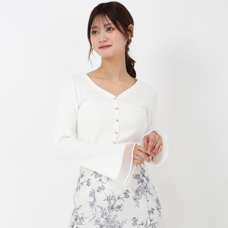 手元を軽やかにみせるシアー切替を施したフレア袖カーディガン。ボディラインに優しくフィットするリブニットとペプラムシルエットが女性らしいデザイン。カーディガンとしてはもちろん、前ボタンを閉じてプルオーバー風にもスタイリングを楽しむことができるアイテムです。■fabric透け感[やや有り]裏地[無し]伸縮性[有り]生地の厚さ[普通]