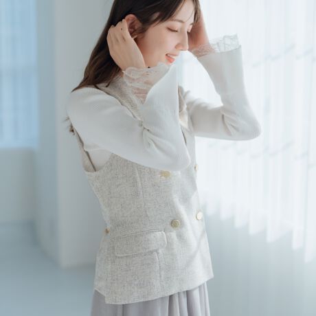 フロントの金釦が上品な風合いを放つアソートジレ。バックのウエストにはベルトが付いており、お好みのサイズに調整することができます。Vネックのデザインが首元をすっきりさせるのもポイント。シンプルなカットソーと重ねた着こなしがおすすめです。■fabric透け感[やや有り]裏地[無し]伸縮性[無し]生地の厚さ[普通]