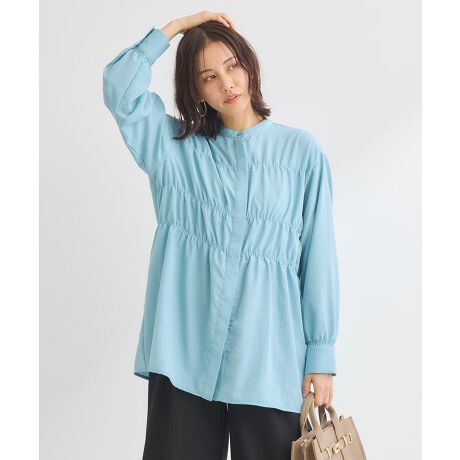 スタイリッシュな着こなしにピッタリのデザインシャツ。バンドカラーと比翼ボタンできちんと感もありつつ、シャーリングを入れたふんわりフォルムがナチュラルな印象です。腰回りもすっぽりと隠れる丈感で、スタイルカバーも叶うのは嬉しいポイント。タイトなスカートやパンツ合わせですっきりとしたスタイリングがおすすめです。透け感[ややあり]