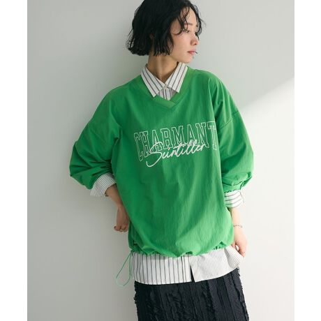スポーティーカジュアルなナイロン素材で仕立てたプルオーバー。Vネックに肩のラインを落としたゆったりシルエットがこなれ感ある一枚です。裾にはドロストゴムでバルーンフォルムにアレンジが可能。フロントのロゴプリントがライトな印象を加え、スタイリッシュに着こなしていただけます。デニム合わせはもちろん、スカートとも好相性なおすすめアイテム。透け感[ややあり]