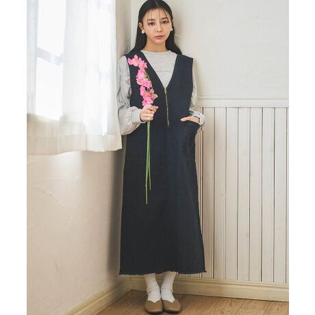 【mil (ミル)】フロントジップ Vネックデニムジャンスカ【低身長・小柄】