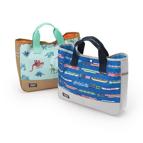 にぎやかな総柄デザインのレッスンバッグです。<br>エメラルドグリーンは恐竜柄、ブルーは電車柄を採用しました。<br>リフレクターつきで光に反射し、視認性を高めてくれるのが魅力。<br>机のフックにかけても底を引きずらないようにするため、短めのループを備えました。<br>はっ水加工がほどこされており、雨の日でも安心。<br>お名前ネームつきです。<br>