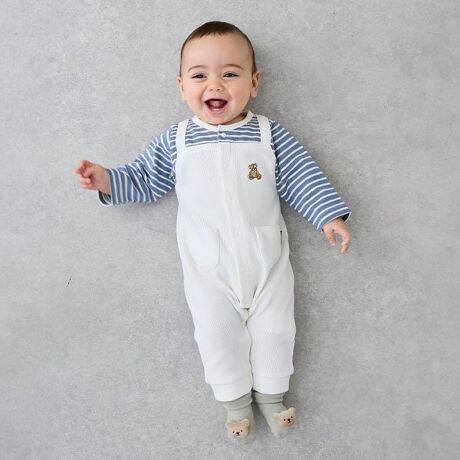 クマさんの刺しゅうが可愛らしいワンポイントになったカバーオールです。