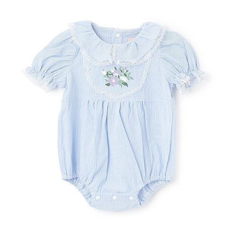 レース仕立てのラウンド衿が女の子らしさを倍増させるロンパースです。