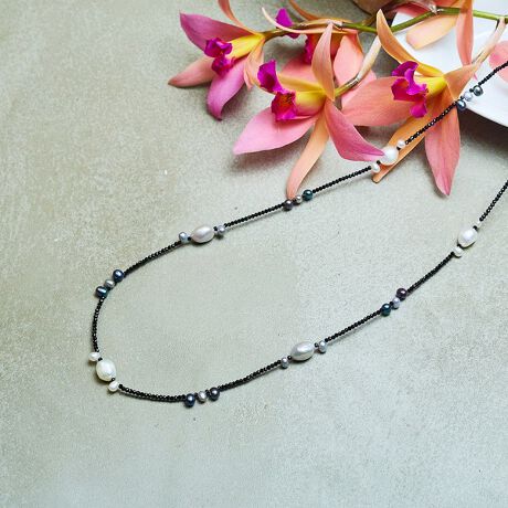ホワイト・グレー・ピーコックカラーのバロックパールをバランスよく配したステーションタイプのロングネックレス。ビーズカットを施した小粒のブラックスピネルが上品な輝きを放ちます。