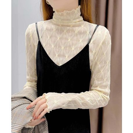 繊細なレース素材を使用したシースルーデザインのハイネック。細かいレースが全体に施され、女性らしいエレガントな雰囲気。程よくフィットするシルエットで、ボディラインを美しく見せる一着です。
