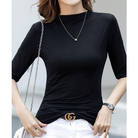 リブ編みで程よいフィット感があり、体に優しく沿うデザイン。五分袖とハイネックが特徴で、シンプルながらも上品な印象を与えます。色展開も豊富で、コーディネートの幅を広げる一着です。