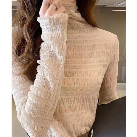 軽やかでエレガントな印象を与えるシアーデザインのハイネックトップス。細やかなギャザーと上品な透け感が特徴で、女性らしい華やかさUP。程よいフィット感と伸縮性があり、インナーとしても単独でも活躍する一着です。デートやお出かけにぴったりなフェミニンアイテムです。