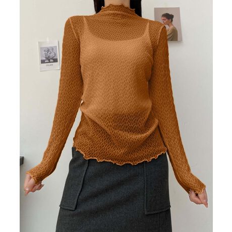 網目模様のデザインとフリルのハイネックが特徴的なハイネックトップス。軽やかで女性らしいシルエットを作り出し、シンプルながらもおしゃれな印象を与えます。体にぴったりフィットするので、レイヤリングにも最適です。寒い季節にぴったりなアイテムです。