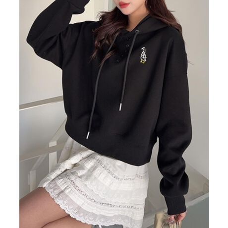 フロントに小さなロゴがあり、ドローストリングで調整可能なフードと、リラックスしたシルエットになります。シンプルでシックな雰囲気で着られるアイテムです。