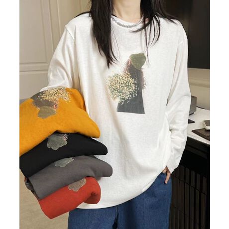 胸元に花束を持つシンプルなイラストがプリントされたカジュアルなロングスリーブTシャツ。リラックス感のあるシルエットで、日常のコーディネートにぴったりなアイテムです。イラストが華やかでありながらも控えめに配置されており、シンプルながらも個性を感じさせます。