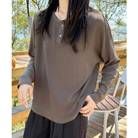 ヘンリーネックのボタンデザインが特徴の長袖Tシャツ。シンプルでありながら、首元のディテールがアクセントとなり、カジュアルでありながらもおしゃれな印象を与えます。ゆったりとしたシルエットで快適に着こなせるアイテムです。