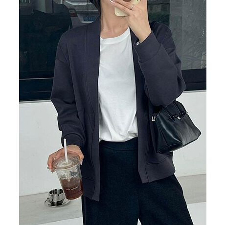 フロントボタンのないトッパーカーディガン。シンプルでどんなスタイルにも合わせやすい万能アイテムです。ゆったりとしたシルエットで、リラックス感とエレガンスがあります。両サイドにポケット付きで実用性も抜群です。
