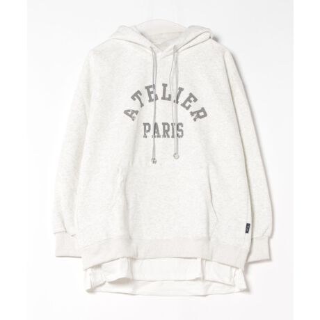 「PARIS」の大きなプリントが特徴的なパーカー。ゆったりとしたシルエットでリラックスした着心地す。フード部分に調整用のひもがついており、好みのサイズ感に調節可能です。カジュアルながら、デザイン性の高いアイテムです。